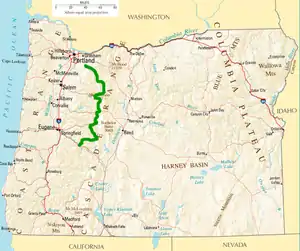 The route is roughly north–south, from Estacada southeast of Portland to Oakridge on the Willamette River southeast of Eugene. Much of the route is very sparsely populated, passing through timber regions in the Cascades.