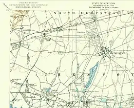 The West Hempstead Branch was the indirect successor to the old South Side Railroad's Southern Hempstead Branch, which ran a similar route north from Valley Stream to Hempstead, before being torn up in the 1880s. On January 26, 1892, the New York Bay Extension Railroad Company was incorporated as a subsidiary of the Long Island Rail Road to build a line running from Garden City to a point in the town of New Lots in Kings County near the intersection with the New York, Brooklyn & Manhattan Beach Railway Company.[8] The 5.89 miles (9,480 m) line was built between Country Life Press to Valley Stream and opened in 1893.[9] The LIRR leased its property in 1897, and formally merged with the New York Bay Extension Railroad on August 29, 1902.[10][11][12] The West Hempstead Branch originally extended beyond its current terminus and through Hempstead. It connected with the current day Hempstead Branch at Country Life Press.[1] From the Country Life Press station, the line had several routings it could take. It could loop west and continue down the Hempstead Branch to Jamaica. Through an elaborate wye system, trains could also loop east and continue down the Central Branch to Babylon (the split between the Hempstead and Central Branches occur just west of Country Life Press). Trains could also head north on the wye and continue all the way north to Mineola and connect with both the Main Line and Oyster Bay Branches.
