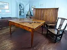 The museum covers military history, with a focus on the Commando Basic Training Centre, set up during the Second World War at Achnacarry Castle near Spean Bridge. In 1936, during the demolition of the fort, the museum was gifted the pine panelling of the governor's room, which it used to create its own Governor's Room. This room also contains the birching table belonging to the burgh (i.e. the town council) of Fort William, used to restrain people subject to judicial corporal punishment; birching was last used to chastise an offending youth in 1948.[9] The round, mahogany wine table in this room is reputed to have belonged to Colonel Hill, Governor of the fort at the time of the Massacre of Glencoe in 1692. Hill met MacIain, chief of the Glen Coe MacDonalds, in the fort prior to the massacre.[10]