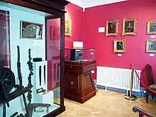 The museum has eight rooms on three floors, with an extensive collection of exhibits relating to the Jacobites, including the 18th century "secret portrait" of Bonnie Prince Charlie which Victor Hodgson found in a London junk shop.[6] Apparently random marks on the base were focused by the cylindrical mirror to show the Prince's image, a painting technique known as anamorphosis.[7] The mirror would be removed when the owners needed to hide their loyalty.[8] Later royalty is represented by a collection of Victoriana, including the regalia gifted by Queen Victoria to her favourite servant, John Brown.
