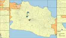 These 9 cities and 18 regencies are divided into 620 districts (Kecamatan), which comprise 1,576 urban villages (Kelurahan) and 4,301 rural villages (Desa).[12] On 25 October 2013, the People's Representative Council (DPR) began reviewing draft laws on the establishment of 57 prospective new regencies (and eight new provinces),[13] including a further three regencies in West Java – South Garut (Garut Selatan), North Sukabumi (Sukabumi Utara) and West Bogor (Bogor Barat) – but none of these three prospective regencies are shown separately on the map below, nor in the following table.