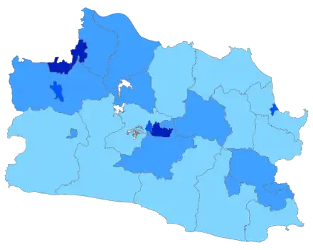 | Bogor Regency | Cibinong | 2,991.78 | 3,829,053 | 4,771,932 | 5,427,070 | 5,566,838 | 1,861 | |
