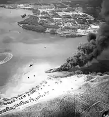Various LSTs managed to move to safety under their own power or with assistance by tugboats. However others were abandoned and allowed to drift, spreading fires, before sinking in the channel. Leaking oil ignited on the water also spread fires to Tares 7 and 9 even though they had been unharmed after the first explosions at Tare 8.[1] Eventually tugboats and foam-carrying salvage ships from Pearl Harbor arrived to fight the spreading fires. One ship managed to turn a drifting LST away from a collision course with an ammunition ship docked across the loch at the ammunition depot.[4]