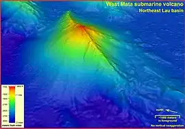 West Mata is an active submarine volcano located in the northeastern Lau Basin, roughly 200 km (124 mi) southwest of the Samoan Islands. It is part of the Tonga-Kermadec volcanic arc, which stretches from the North Island of New Zealand to Samoa. The volcano was first discovered in 2008 by scientists aboard the R/V Thompson research vessel, using sonar mapping and a remotely operated vehicle (ROV) to explore the seafloor. At the same time West Mata was discovered, multiple neighboring volcanoes—most of them hydrothermally active—were discovered as well, including Volcano O, Tafu-Maka, Northern Matas and East Mata.[4]