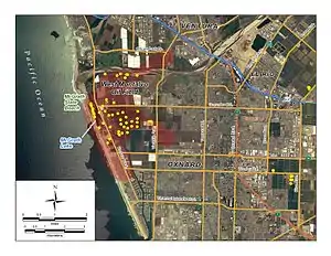 The West Montalvo Oil Field is a large and productive oil field on the coast of Ventura County, California, in the United States, in and adjacent to the city of Oxnard, California. Discovered in 1947,[1] it has produced approximately 43.7 million barrels (6,950,000 m3) of oil, and retains about 2.2 million recoverable with current technology, in both the onshore and offshore areas. The offshore portion of the field is exploited from wells directionally drilled from onshore near McGrath Lake, from within an enclosure above the high-tide line at McGrath State Beach.