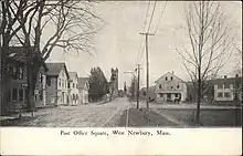 During the 19th century, West Newbury was home to a vibrant industrial scene.[13] The town was renowned for its comb making industry. Beginning in the 1840s, small home-based comb shops gave way to large-scale factories that produced horn combs and hair adornments. S.C. Noyes, located at 320 Main Street, was the last remaining comb factory in town and shut its doors in 1904.[14] In addition to comb making, a shoe factory operated where the West Newbury Pizza Company currently exists.