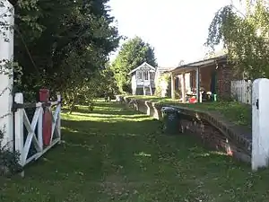 At Holkham the railway line curved away from the main village centre dominated by Holkham Hall, and followed a path nearer the coast. The line had been opposed by the occupant of Holkham Hall, the Earl of Leicester, who feared that it would lead to large scale resort development and an influx of holiday visitors near his home.[9] A station was nevertheless opened opposite the main gates of Holkham Park which had been laid out by Thomas Coke who had reclaimed from the sea some of the land over which the railway now ran. The station's approach road, Lady Ann's Drive, continued for around half a mile to the beach at Holkham Gap. The station itself was very small, equipped with a single platform and no goods facilities. Architecturally, it was a miniature version of the Great Eastern's "Victorian House" design, incorporating a small platform canopy. There was a level crossing over Lady Ann's Road which was controlled by a wooden signal box.[9]