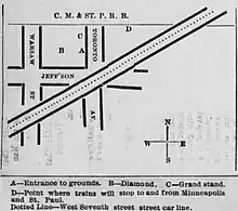 The ballpark was on a block bounded by St. Clair Avenue (north); Duke Street (east); the Chicago Milwaukee & St. Paul Railroad and Grace Street (south); and Oneida Street (west). It was a short block northwest of the angling thoroughfare known as West Seventh Street or Fort Road.