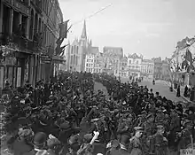 In June 1942, the regiment transferred to the Guards Armoured Division, landing with it in Normandy in June 1944 after on D-Day. It fought throughout the campaign in North West Europe with the division until the end of the war, including Operations Epsom, Goodwood, and Bluecoat in Normandy, the attempt to seize Arnhem bridge (Operation Market Garden), Operation Veritable in the Reichswald, and the crossing of the River Ems.[87][88][89] The division's published history always refers to the regiment as the West Somerset Yeomanry, which suggests that this was how they referred to themselves,[89] and the Commonwealth War Graves Commission records its casualties under '55 (West Somerset Yeomanry) Field Regt' rather than '55 (Wessex)'.[90]