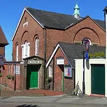 The chapel is a small, red-brick building in the Classical style.[14][21] The brickwork is considered to be of high quality, and the building has been described as "restrained and dignified".[22] The façade has recessed semicircular arched windows and is topped with a pediment of brick, above which is a slate roof.[20][21] The later extensions to the side and in front changed the character of the building, and the original railings in front do not survive in their original condition.[14][20]