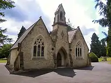In about 1870 the two chapels were built, one for Church of England services and the other for Nonconformist services.[2] The cemetery came under the control of the Joint Burial Committee in 1895 and Farnham Council on 27 July 1926. In 1947 an additional area of 16.2 acres was obtained of which 9.6 acres were turned over to the Cemetery for use as an additional area for burials. This new burial ground is beyond a vintage brick wall which bisects the two halves of the cemetery. A report in 1947 records that common graves with a single burial at 6 ft could be reused after about 14 years. After passing into the hands of Waverley District Council it was transferred to Farnham Town Council in 2006.[3][4]