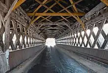 The West Swanzey Covered Bridge is located just west of the village center of West Swanzey, carrying Main Street over the Ashuelot River in a roughly east–west orientation. It is one of two bridges in the village; the other is a modern one about 0.25 miles (0.40 km) downriver. It is a two-span Town lattice truss structure, 136'10" long, with spans measuring 64'0" and 63'6",[2] and rests on a stone central pier and abutments. It is covered by a shallow-pitch metal gabled roof, which extends beyond the trusses to shelter sidewalks on both sides. Only one of the sidewalks now survives, although evidence of the separate walkway portals survives. The main vehicle portals have segmented-arch tops, which are echoed in the pedestrian portals.[3]