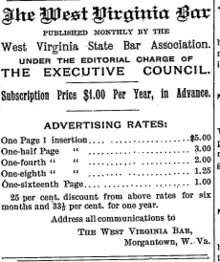 The journal underwent several name changes. It was established in 1894 as The West Virginia Bar by William P. Willey.[2][3] The name was changed to The Bar in 1902. It was again changed in 1917 to the West Virginia Law Quarterly and The Bar and remained so until 1950 when it obtained its current title. As Willey was a prominent and active member of the West Virginia Bar Association, the early years of The Bar were closely associated with it. The Bar was at first funded by advertisements and subscriptions, and published monthly issues. Willey served as the editor-in-charge from 1894 until he retired in 1917.[2] He began using the assistance of student editors in 1915.