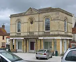 In a central position on the Market Place, the early 19th century former town hall is in Bath stone ashlar and has a colonnaded front at street level, behind which shops were inserted in the 1970s.[35] The first floor windows have balustraded aprons below, and above them the triangular pediment has the Lopes arms in the tympanum.[26]