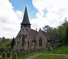 Many pre-1800 listed buildings including some that are thatched are in the lanes leading off the A25, including Leslie Howard's (actor 1893–1943) Stowe Maries (built in the 1550s) in Balchins Lane. Milton Street and Westcott Street lead to several more old buildings.[5] The Church of the Holy Trinity is Grade II* as it was commissioned to be designed 1851, by Sir George Gilbert Scott made of knapped flint with ashlar quoins/dressings. Its spire has a clock, striking bell and weather vane.[6] The church is built of stone, with a small western turret. Charles Barclay of Bury Hill gave equivalent to £116,485 in 2021 for it to be built, and Lady Mary Leslie the same as an endowment. The clock was installed to commemorate the Jubilee of 1887. The parsonage was built at the expense of Barclay and the secular Westcott School was built by subscription in 1854; the infant school by subscription in 1882.[4]