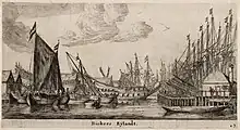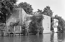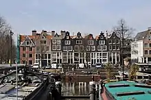 Reael gave credit to ship carpenters, who did not have to pay rent for the first twelve years, but had to deliver a ship. He also had houses built on the island, which the city opposed.[8] The Tar Company of Joseph Deutz got a large yard on the Realen Island in 1664.[9] Until 1673 there was also a peat market. Sand was stored on the Zandhoek, which was used as ballast and for raising streets and neighborhoods in the center. As early as 1676 there was a brandy distillery at the Drieharingenbrug, called De drie gecroonde haringen (The three crowned herrings). These business premises were demolished around 1780 by shipbuilder Haring Booy and rebuilt as a sort of country house.[10] For many years, the tobacco firm British American Tobacco was established on Realeneiland. The island became known through the books of Jan Mens about the Golden Reael. There are still thirteen impressive captain's houses.