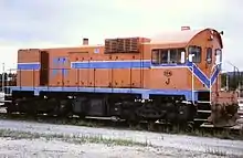 Initially, Westrail applied an orange with blue stripe livery to its locomotives and passenger vehicles. Freight rolling stock and road trucks were painted yellow, and blue was used on all signs, buildings and printed material. The Westrail logo incorporated a stylised "W" surmounted by a solid bar representing a railway track. Between the bar and the "W" was the word "Westrail".[12]