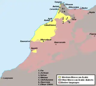 ![]() Map showing Western Moroccan Arabic speaking areas (yellow) | |