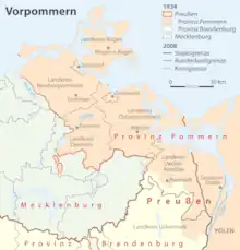 Historical Western Pomerania, also called Cispomerania,[1][2] Fore Pomerania, Front Pomerania or Hither Pomerania (German: Vorpommern), is the western extremity of the historic region of Pomerania forming the southern coast of the Baltic Sea, Western Pomerania's boundaries have changed through the centuries as it belonged to various countries such as Poland, the Duchy of Pomerania (later part of the Holy Roman Empire), Sweden, Denmark, as well as Prussia which incorporated it as the Province of Pomerania.