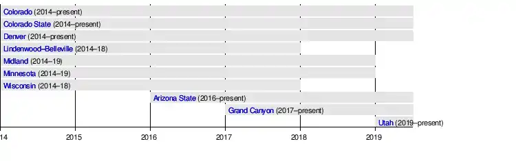 Among the ten members the conference has hosted, both Minnesota (2013) and Wisconsin (2002 and 2004) won ACHA national championships prior to joining the WWCHL, while Colorado and Colorado State also have lengthy histories pre-dating the conference's creation. The rest of the league roster, however, consists of newer programs, largely in emerging hockey locales. Denver began play, as the WWCHL itself did, for the 2014–15 season. Arizona State started its program in 2016–17[1] while Grand Canyon and the University of Utah did so in 2017–18 and 2019–20, respectively.[2]