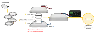 To make the proteins accessible to antibody detection, they are moved from within the gel onto a membrane, a solid support, which is an essential part of the process. There are two types of membrane: nitrocellulose (NC) or polyvinylidene difluoride (PVDF). NC membrane has high affinity for protein and its retention abilities. However, NC is brittle, and does not allow the blot to be used for re-probing, whereas PVDF membrane allows the blot to be re-probed.[1] The most commonly used method for transferring the proteins is called electroblotting. Electroblotting uses an electric current to pull the negatively charged proteins from the gel towards the positively charged anode, and into the PVDF or NC membrane. The proteins move from within the gel onto the membrane while maintaining the organization they had within the gel. An older method of transfer involves placing a membrane on top of the gel, and a stack of filter papers on top of that. The entire stack is placed in a buffer solution which moves up the paper by capillary action, bringing the proteins with it. In practice this method is not commonly used due to the lengthy procedure time.