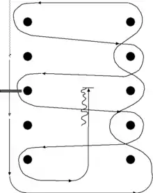 Western Riding is a competitive event at American horse shows, particularly those for stock horse breeds such as the American Quarter Horse. It is not to be confused with the general term "western riding," referring to the many forms of equestrianism where riders use a western saddle; instead, it refers to a particular class where the horse and rider complete a pattern that incorporates elements of both reining and trail classes, but requiring horses to perform in a quiet style akin to that of a Western pleasure class. Horses are evaluated on “quality of gaits, lead changes at the lope, response to the rider, manners and disposition."[1] While all three gaits are required, most of the pattern is performed at a lope. Emphasis is placed on the horse's smoothness, even cadence, and precise, clean flying lead changes.