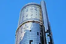 The building is cast in reflective glass in a cylindrical shape that reflects much of the downtown skyline (though each of the around 5600 windows are flat and not convex). Another small cylinder runs the full height of the building on one side, and accommodates two scenic elevators. The uppermost floors hold the Sun Dial Restaurant and Bar, a revolving restaurant that offers panoramic views of the city and its environs. The top floor of the restaurant completes a full revolution every 30 minutes, and the bottom every 60 minutes.