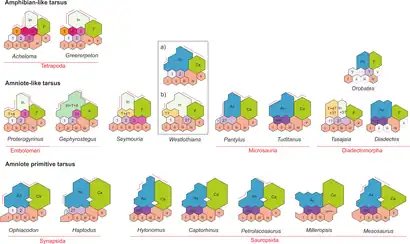 The ankle of Westlothiana, as well as that of most other "reptiliomorphs", is intermediate between these two conditions. Smithson (1989) reported that "Lizzie" had nine ankle bones, including an astragalus and calcaneum, and that the third and fourth centrales were already fused or lost. Yet he also noted that centrales one and two (which formed the navicular bone) were unfused.[2] Smithson et al. (1993) later claimed that there were ten bones, arguing that the components of the astragalus were not completely fused, with the intermedium and tibiale still separate.[3] Piñeiro, Demarco, & Meneghel (2016) could not determine which of these two interpretations were superior, but did note that the largest bone more closely resembled a fused astragalus rather than an unfused intermedium.[12]