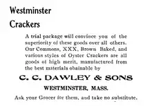 In 1909, a photograph of the decorated cracker factory was published in the 150th Anniversary Celebration of the Town of Westminster, Massachusetts by Wilbur F. Whitney.[7] The company's owners, C. C. Dawley & Sons, were participants of that year's float, constituting "5 decorated teams representing the baking business."[7] "Mrs. C. C. Dawley" was a member of the parade committee.[7]