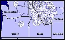 | The historic distribution of westslope cutthroat trout in the United States (modified from Behnke 1992). The large region consists primarily of the upper Columbia River and upper Missouri River basins; some waters in the eastern part of this region may not have been occupied historically (MTFWP, in litt. 1998). Also shown are the Lake Chelan and Methow River drainages in Washington and the John Day River drainage in Oregon.[1] | |