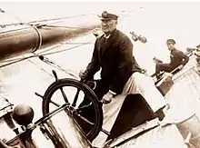 Her racing career was put on hold seemingly indefinitely when Captain Barr died suddenly of a heart attack on January 24, 1911.[5] Cochran was heartbroken at the loss of his friend and sold the Westward for £100,000 to Albert Ballin who was the director of Hamburg-America Line. The new owners changed the Westward's sail plan, painted her black and renamed her Hamburg II.[6] After a brief run in the 1913 Kiel Regatta in which she placed third, Hamburg II was laid up. World War I delayed her return to service and she passed through a string of owners before falling into the hands of Mr. Clarence Henry, a well known London financier who also restored her original name.[7]