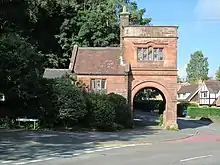 The former lodge on the eastern approach to Westwood Hall is on Westwood Park Drive, grid reference SJ 971 563. It is a Grade II listed building, and is presumed to be by the architects of the hall, Hadfield Weightman and Goldie. It is of red sandstone. Above the archway over the former driveway to the hall, in low relief, is the date: "ANNO DOMINI 1852".[4]