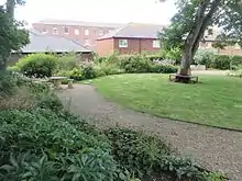 View in Weymouth Peace Garden with barracks behind