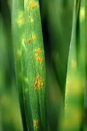 Wild grasses in the genus Triticum and related genera, and grasses such as rye have been a source of many disease-resistance traits for cultivated wheat breeding since the 1930s.[63] Some resistance genes have been identified against Pyrenophora tritici-repentis, especially races 1 and 5, those most problematic in Kazakhstan.[64] Wild relative, Aegilops tauschii is the source of several genes effective against TTKSK/Ug99 - Sr33, Sr45, Sr46, and SrTA1662 - of which Sr33 and SrTA1662 are the work of Olson et al. 2013, and Sr45 and Sr46 are also briefly reviewed therein.[65]