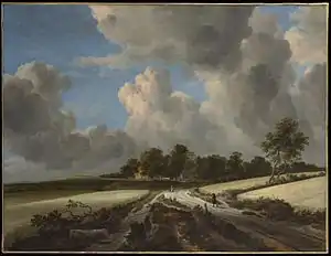 Wheat Fields is a Dutch landscape painting created by Jacob van Ruisdael. The painting is one of twenty-seven works that Ruisdael produced concerning fields of grain. Ruisdael's work depicts a road passing between two fields of wheat. Beyond the fields, a small woods and a house can be seen. In the far left corner of the painting, the coastline and several ships at sea can be made out. Towering clouds drift in the sky above the scene, and several people can be seen coming and going along the road. In addition to familiar pastoral themes, Ruisdael included intricate depictions of various forms of flora. Attention was not only lavished on the uniform blocks of wheat, but also on the verdant tendrils of grass and weeds that has encroached upon the roadway. Trees, both alive and fallen, are also pictured.[1][2]