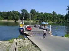 The Wheatland Ferry is a cable ferry that connects Marion County and Yamhill County across the Willamette River in the U.S. state of Oregon. The ferry travels approximately 580 feet (180 meters) across the river, depending on the height of the river, and is powered by two electric motors connected to an on-board diesel generator. The ferry is supported by two steel cables, one under water on the downriver side, and one overhead on the upriver side. The ferry also uses the overhead cable for steering.