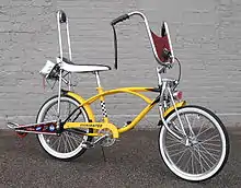 A wheelie bike, also called a dragster, muscle bike, high-riser, spyder bike or banana bike, is a type of stylized children's bicycle designed in the 1960s to resemble a chopper motorcycle and characterized by ape hanger handlebars, a banana seat with sissy bar, and small (16-to-20-inch (410 to 510 mm)) wheels.[1][2][3] Notable examples include the Schwinn Sting-Ray and Krate lines and the Raleigh Chopper line. Other notable manufacturers and retailers that offered models include AMF, CCM, Columbia, Huffy, Iverson, J. C. Penney, Malvern Star, Monark, Murray, Ross, Sears, and Vindec.