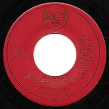RCA released "When You Say Nothing at All" as the follow-up single to the title song of Whitley's Don't Close Your Eyes album. The former song already had hit No. 1 on the Billboard Hot Country Singles chart, his first chart-topper after three prior singles made the top 10.[3] "When You Say Nothing at All" entered the Hot Country Singles chart on September 17, 1988, at No. 61, and gradually rose to the top, where it stayed for two weeks at the end of the year.[1][2] It was the second of five consecutive chart-topping singles for Whitley, who did not live to see the last two, as he died on May 9, 1989, of alcohol poisoning.[3] "Keith did a great job singin' that song," co-composer Schlitz told author Tom Roland. "He truly sang it from the heart."[2] In 2004, Whitley's original was ranked 12th among CMT's 100 Greatest Love Songs.[4] It was sung by Sara Evans on the show. As of February 2015, the song has sold 599,000 digital copies in the US after it became available for download.[5]
