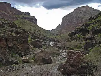 The mountain forms a major direction change of the north-south Colorado River as it changes directions to southeast, then southwest around the eastern perimeter of the Whipple Mountains. The highest point of the mountains, and the Whipple Mountains Wilderness is Whipple Mountain at 4,131 feet (1,259 m). The western portion of the mountain range has pale green formations, differing from the eastern, steeply carved and striking brick-red volcanics. Landforms are diverse and range from valley floors and washes to steep-walled canyons, domed peaks, natural bridges, and eroded spires.[4]