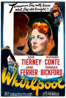 Whirlpool is a 1950[1][2] American film noir thriller directed by Otto Preminger and written by Ben Hecht and Andrew Solt, adapted from the 1946 novel Methinks the Lady... by Guy Endore. The film stars Gene Tierney, Richard Conte, José Ferrer and Charles Bickford, and features Constance Collier in her final film role. Its plot follows the insomniac wife of a wealthy Los Angeles psychoanalyst who, after a chance meeting with a hypnotist, is charged with a violent murder.