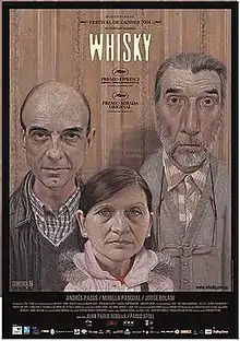 Whisky is a Uruguayan tragicomedy film directed by Juan Pablo Rebella and Pablo Stoll and released in 2004.[1] The film stars Andrés Pazos, Mirella Pascual, Jorge Bolani, Ana Katz, and Daniel Hendler. It has sparse dialogue and the three principal actors play very rigid roles depicting little emotion. It was premiered at the 2004 Cannes Film Festival where it won the Un Certain Regard and FIPRESCI Awards.[2] It was Juan Pablo Rebella's last film as he died in 2006, two years after the release of the film.