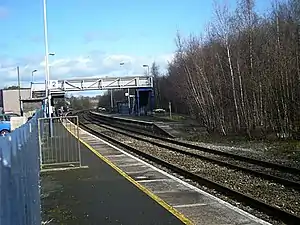 The station has two platforms and a footbridge. There used to be a large signal box here (which was latterly switched out of use, although operational if required) but this was closed and demolished in 2012[4] whilst the one-time goods shed has been turned into a garage. The former up loop and down bay platforms have both had their track removed (the former is fenced off) and the main buildings (booking hall, waiting room and offices) have also been demolished.[3]