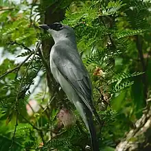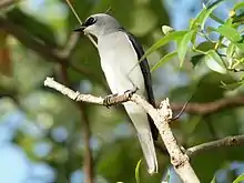 The white-bellied cuckooshrike was formally described in 1788 by the German naturalist Johann Friedrich Gmelin in his revised and expanded edition of Carl Linnaeus's Systema Naturae. He placed it with the crows in the genus Corvus and coined the binomial name Corvus papuensis.[2] Gmelin based his description on "Le Choucari de la Nouvelle Guinée" that had been described in 1775 by the French polymath the Comte de Buffon and illustrated with a hand-coloured engraving by François-Nicolas Martinet.[3][4] The type location was restricted to Manokwari in the Indonesian province of West Papua by Erwin Stresemann in 1913.[5][6] The white-bellied cuckooshrike is now one of 22 species placed in the genus Coracina that was introduced in 1816 by French ornithologist Louis Vieillot.[7]