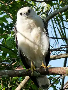 The white-necked hawk is 43 to 48 cm (17 to 19 in) long with a 91 to 101 cm (36 to 40 in) wingspan. Males and females have the same plumage, though females are about 4% larger than males. Adults have a white head and underparts and black upperparts. Their tail is black with a wide white band in the middle. Their eye is brown or pale yellow and their legs and feed yellow. Immatures are similar to adults but with dark streaks on their crown and neck, brown tips on some upperparts feathers, and white barring on the black base of their tail.[4]