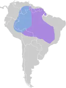 The white-throated kingbird is a species of the mostly eastern Amazon Basin as a resident species; it is a non-breeding migratory resident into the western Amazon Basin, during the austral winter. Its range expands eastwards to the cerrado (where it is a passage migrant in the northern part) and northwards into the Guiana Shield excepted the coastal region (east toward Marajó Island).
