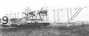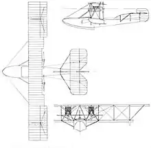 The twin-engined aircraft, the White & Thompson No. 1 Seaplane, was a biplane powered by two pusher Curtiss OX water-cooled V-8 engines driving three-bladed propellers with adjustable pitch.[4][5] It was of wooden construction, with the fuselage built of elm and spruce planked with mahogany. The crew of two sat side-by side in a cockpit fitted with dual-controls just ahead of the wings. Its tail assembly had a large fin which was supplemented by two auxiliary fins mounted on the upper wing, and a high mounted horizontal tail.[4][5]