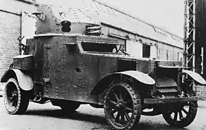 The White AM armoured car (officially the Automitrailleuse White or abbreviated as the White AM) was a French First World War armoured car that was built on a commercial American White Motor Company truck chassis with armoured bodies supplied by the French firm Ségur & Lorfeuvre, it was used by the French military from its introduction in 1915. Between the wars the French military completely rebuilt the vehicles as the White-Laffly AMD 50 and the Laffly-Vincennes AMD 80, in these guises it served until at least 1943.