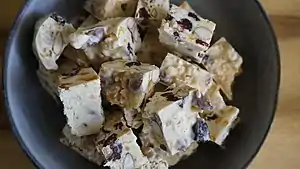 White Christmas is an Australian dessert[1] made from dried fruit such as sultanas, glacé cherries, desiccated coconut, icing sugar, milk powder and Rice Bubbles, with hydrogenated coconut oil (such as the brand Copha) as the binding ingredient.