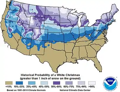 According to research by the CDIAC, the United States during the second half of the 20th century experienced declining frequencies of white Christmases, especially in the northeastern region.[18] The National Climatic Data Center based the probability of a white Christmas (1 in or 2.5 cm of snow on the ground) at selected cities upon the 1981–2010 numbers from stations with at least 25 years of data.[3]