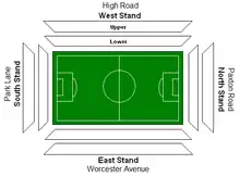 The outer White Hart Lane frame was designed in a rectangular shape, with the inner seating tiers being rounded to maximise the number of seats possible within the structure. The cockerel was placed upon the West Stand, with the West Stand located on Tottenham High Road, the East Stand being on Worcester Avenue, the North Stand on Paxton Road and the South Stand on Park Lane. The stands were officially named after compass points, but were more colloquially referred to by the road onto which they back.[67]